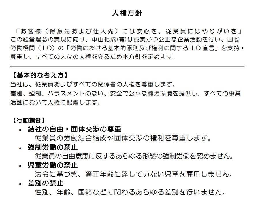 「人権方針」を定めました 2025年10月21日、中山化成有限会社では、「労働における基本的原則及び権利に関するILO宣言(国際労働機関)」を支持し、人権方針を定め公表します。 経済発展・社会開発といった目的の中で、公平性の担保や貧困の撲滅、社会 […] 「人権方針」を定めました 続きを読む »